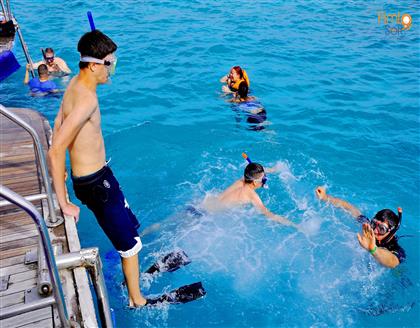 During the trip, you’ll also explore stunning coral reefs teeming with colorful fish and marine life, soak up the sunshine on deck, or relax in the shaded areas of the boat. A delicious onboard lunch and refreshing drinks will make your adventure even more enjoyable, while the crew and snorkel guide ensure your comfort and safety throughout the day.